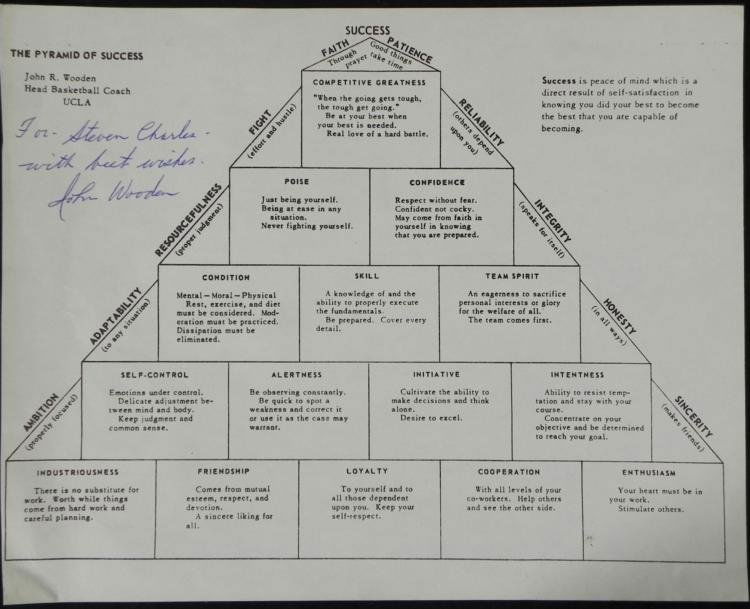 The John Wooden Pyramid Of Success: Neville Johnson ... from images-na.ssl-images-amazon.com May come trom being prepared and keeping all things in proper perspective. Namely, to get maximum effort and peak performance from each of his players in the manner that best served the team. Like the proper way to lace up shoes. Our latest collection of john wooden quotes on everyday power. Whatever it is you're trying to accomplish, apply these eight rules and you will succeed just as wooden defined it. My century on and off the court. — john wooden, from his book (with steve jamison) wooden: Which meant practicing the fundamentals well.